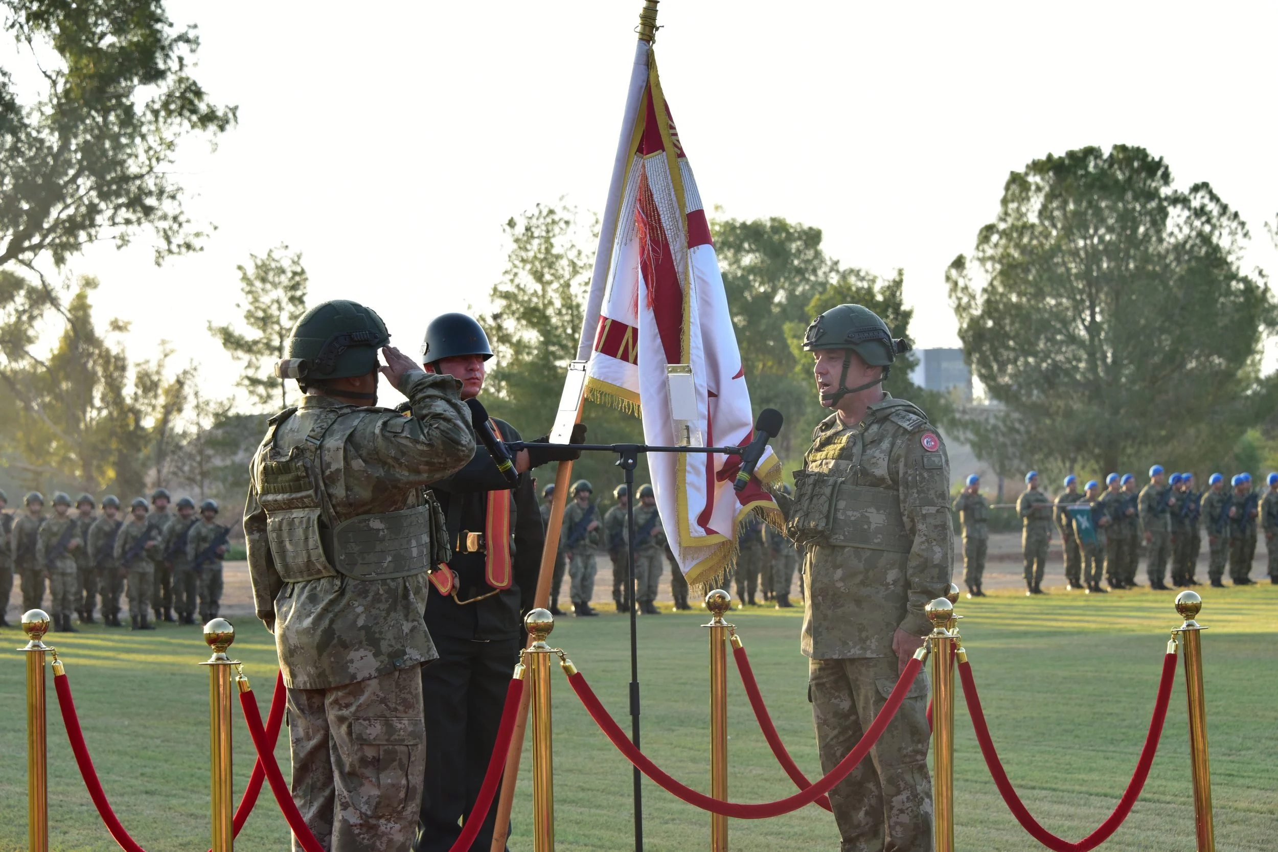 Piyade Albay Ahmet Tevfik Aval ile Ulaştırma Kurmay Albay Salim Atilla Tosun, sancak devir teslim andını okumalarının ardından Güvenlik Kuvvetleri Komutanı Tümgeneral İlker Görgülü, devir teslim tutanağını imzaladı.