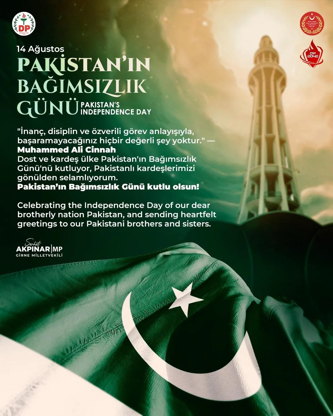 Demokrat Parti (DP) Genel Sekreteri ve Girne Milletvekili Serhat Akpınar, Pakistan’ın 14 Ağustos Bağımsızlık Günü dolayısıyla bir kutlama mesajı yayımladı.