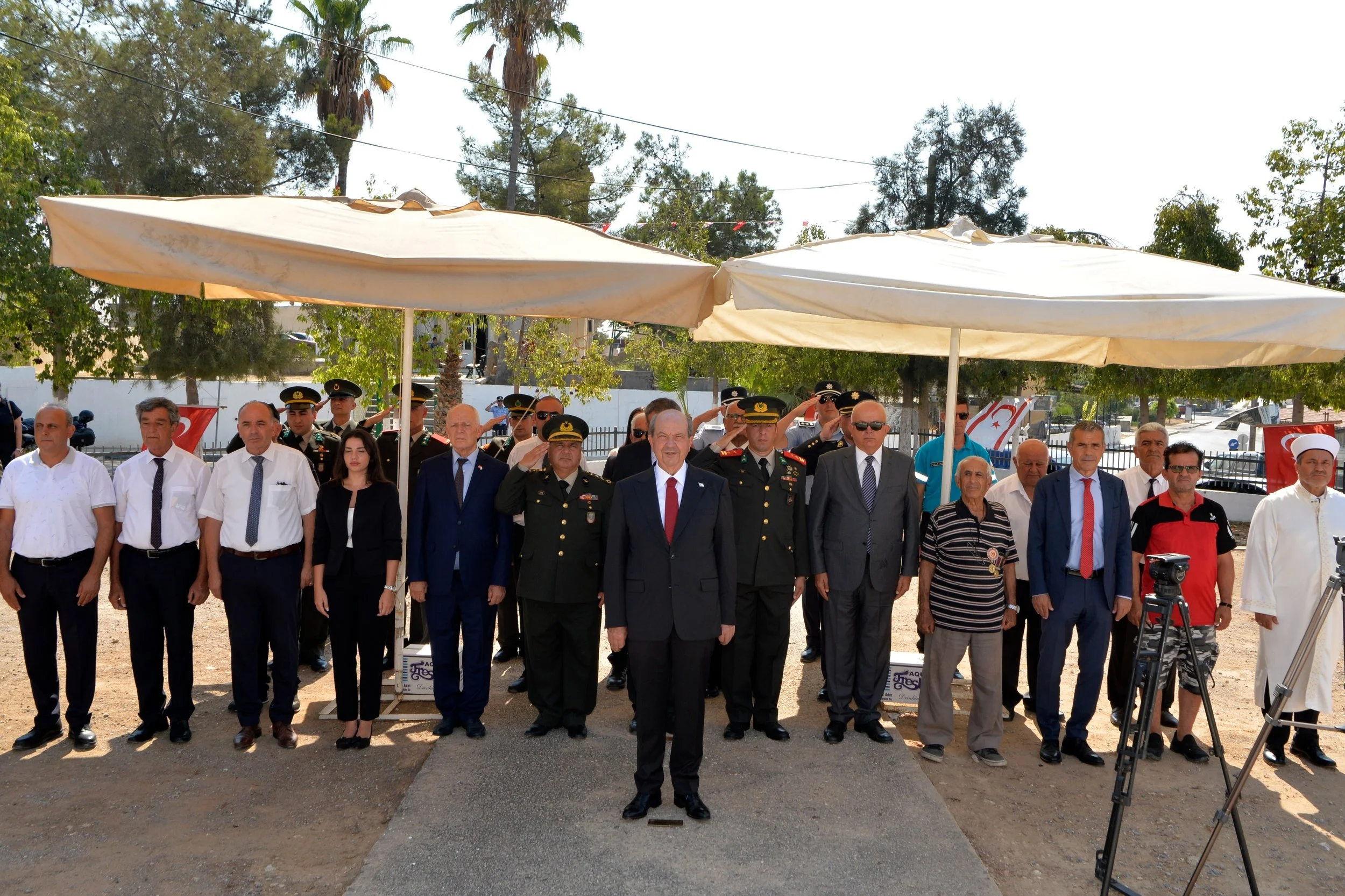 Cumhurbaşkanı Ersin Tatar da, törene katılarak konuşma yaptı. Tatar, bugün huzur ve güven içinde yaşanabiliyorsa bunun Anavatan Türkiye ve şehitlere borçlu olunduğunu söyledi.