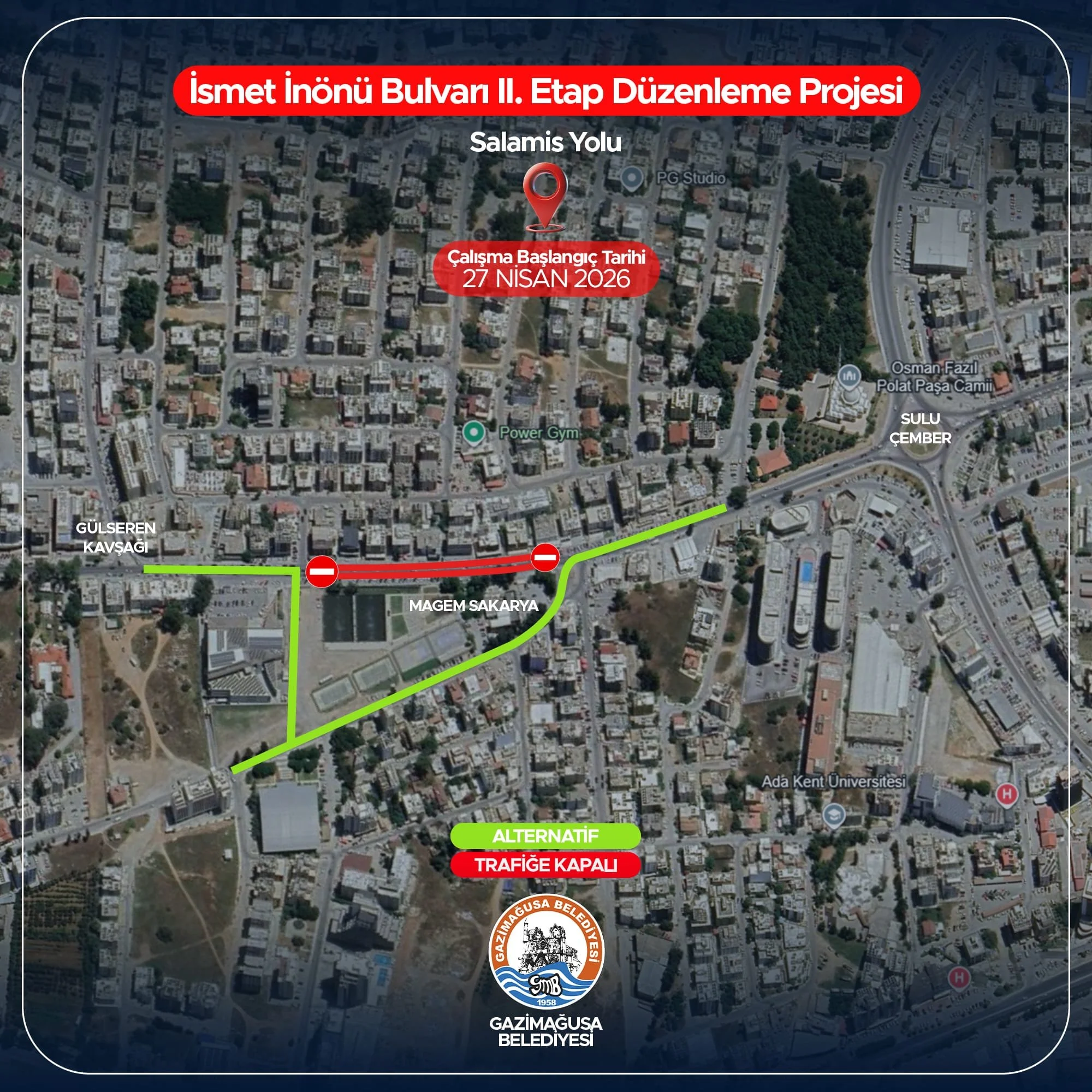 Belediyeden yapılan açıklamaya göre söz konusu yol, İsmet İnönü Bulvarı (Salamis Yolu) 2. Etap Düzenleme Projesi kapsamında sürdürülen altyapı ve kaldırım çalışmaları nedeniyle geçici süreyle ulaşıma kapatılacak.
