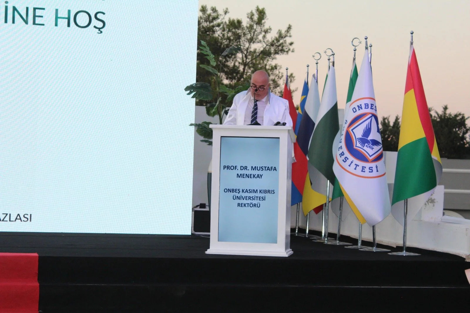 Tören, Onbeş Kasım Kıbrıs Üniversitesi Rektörü Prof. Dr. Mustafa Menekay’ın yaptığı konuşma ile devam etti. Menekay, üniversite örencilerini mezun etmesi sebebiyle büyük bir sevinç içinde olduğunu ve bu mıtlu günlerine eşlik eden Başta Cumhurbaşkanı Ersin Tatar olmak üzere herkese teşekkür etti.