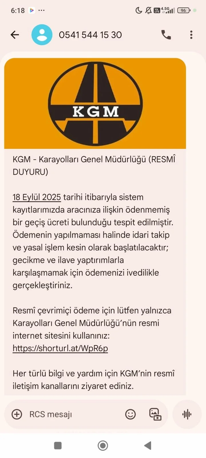 “Karayolları Genel Müdürlüğü (KGM) ile ilgili sorgulama veya ödeme gerekiyorsa doğrudan KGM’nin resmi internet sitesi veya resmi iletişim kanalları üzerinden işlem yapın. Kısa URL’lere güvenmeyin.