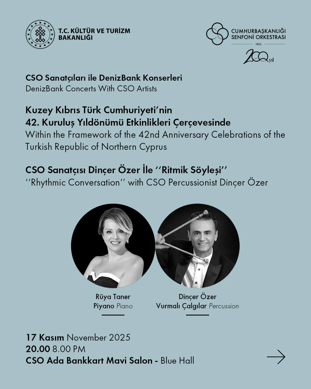 Kuzey Kıbrıs Türk Cumhuriyeti’nin 42. kuruluş yıldönümü etkinlikleri kapsamında, Cumhurbaşkanlığı Senfoni Orkestrası (CSO) sanatçısı Dinçer Özer ile piyanist Rüya Taner, CSO Ada Ankara – Bankkart Mavi Salon’da sahne alacak.